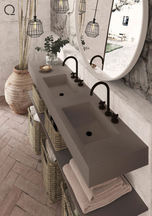 The Frame countertop in special colors—Terracotta, Fossil, and Gold—stands out for its contemporary style and decorative character. Its integrated basin with a smooth surface adds simplicity and sophistication. Available in a Liso or Pizarra texture and with the option of installation on a cabinet or suspended on the wall, it is perfect for those seeking a bathroom with personality and visual balance.