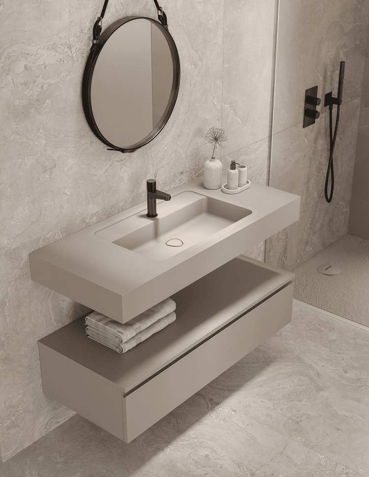 The Orion countertop belongs to the collection of the same name, created to celebrate Quare’s 10th anniversary. Its triangular drain cover with rounded corners, an iconic feature of the line, gives it a unique design. With a Liso texture and refined style, it conveys elegance and exclusivity.